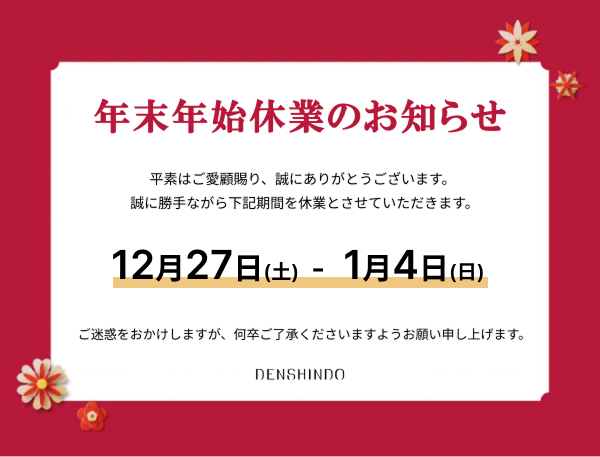 12月30日以降のご注文分は、1月5日(月)以降の発送となりますので、ご了承ください。